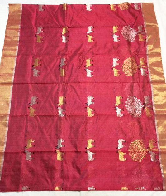 Ruby Pink Chanderi Silk Saree With Animal Print and Gold Border- CSH002