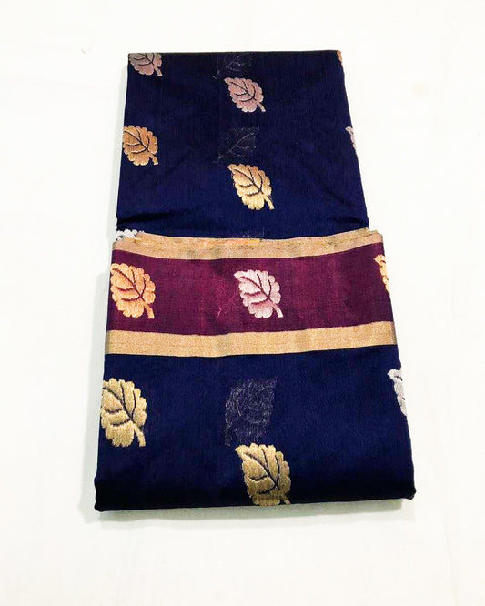 Raven Black Chanderi Silk Saree With Gold & Silver Leaves- CSH003