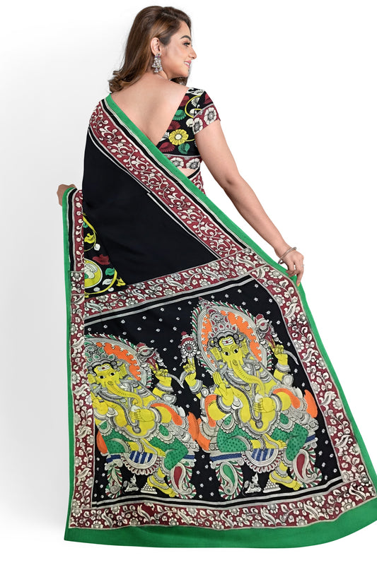 Multicoloured Dual Ganesha Hand-Painted Chennur Silk Kalamkari Saree