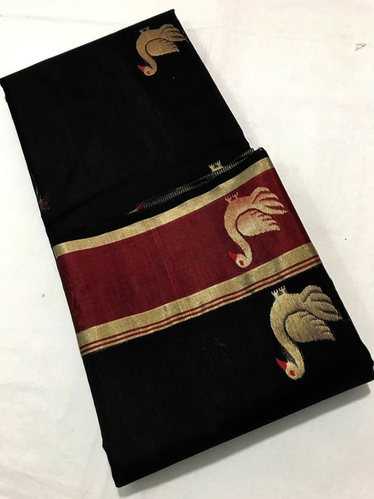 Black with Golden Hamsa Bird Designed Maroon Border Chanderi Silk Saree