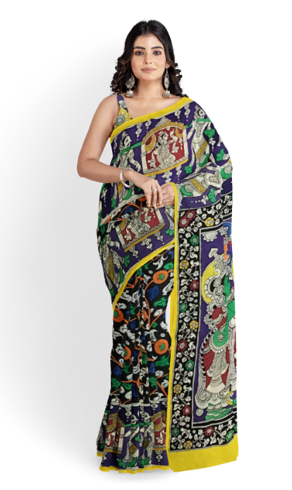 Exquisite Multicoloured Saraswati Hand-Painted Chennur Silk Kalamkari Saree