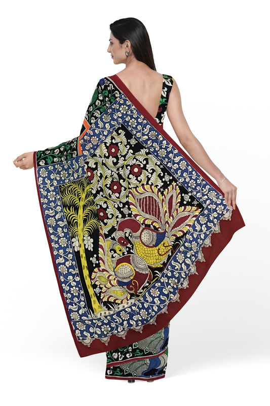 Multicoloured Oriental Bird Hand-Painted Chennur Silk Kalamkari Saree