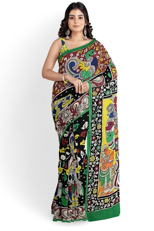 Multicoloured Radha-Krishna Hand-Painted Mul-Mul Cotton Kalamkari Saree