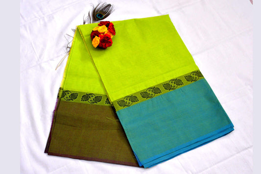 Parrot Green with Floral Designed Double Color Border Pure Handwoven Chettinad Cotton Saree