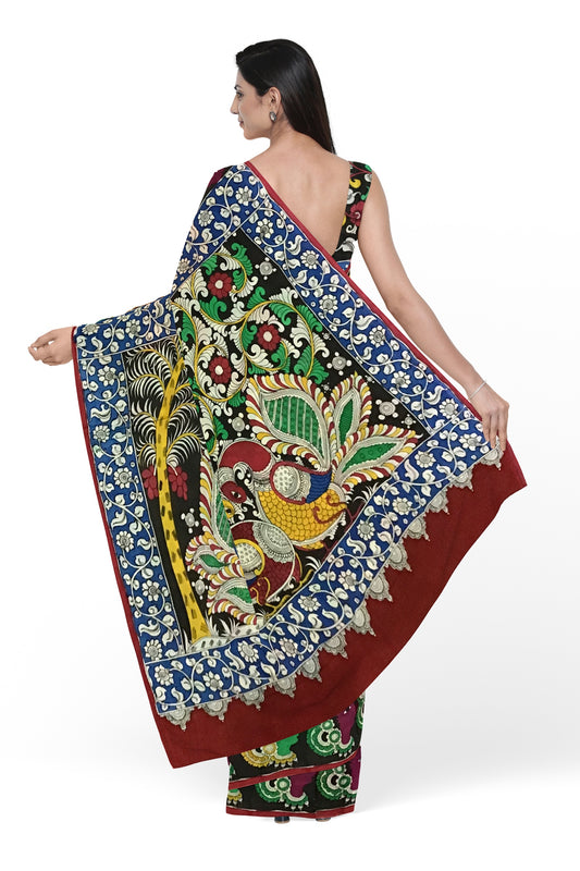 Multicoloured Intricate Hand-Painted Chennur Silk Kalamkari Saree - KPMCS104
