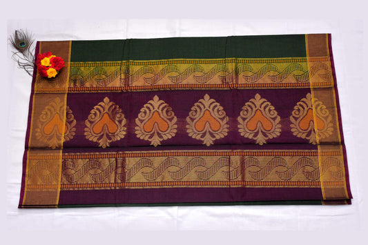 Dark Green with Yellow and Pink Floral Designed Purple Pallu Handwoven Chettinad Silk Cotton Saree