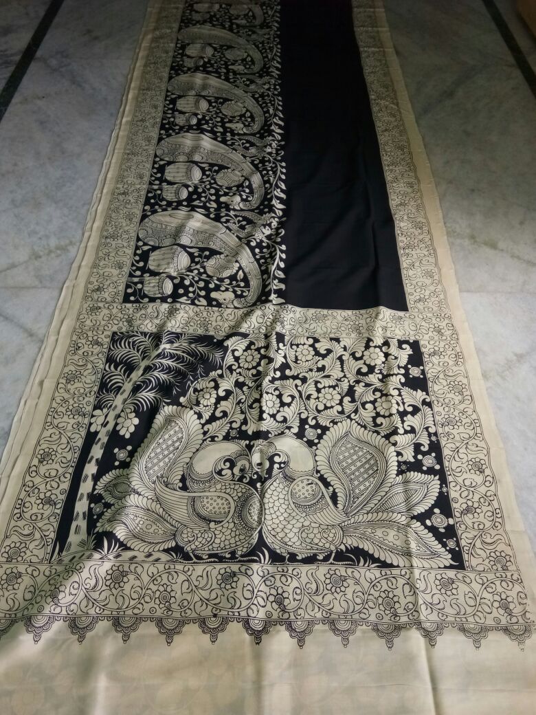 Black and White Kalamkari Printed Chennur Silk Saree-KPCHS-071