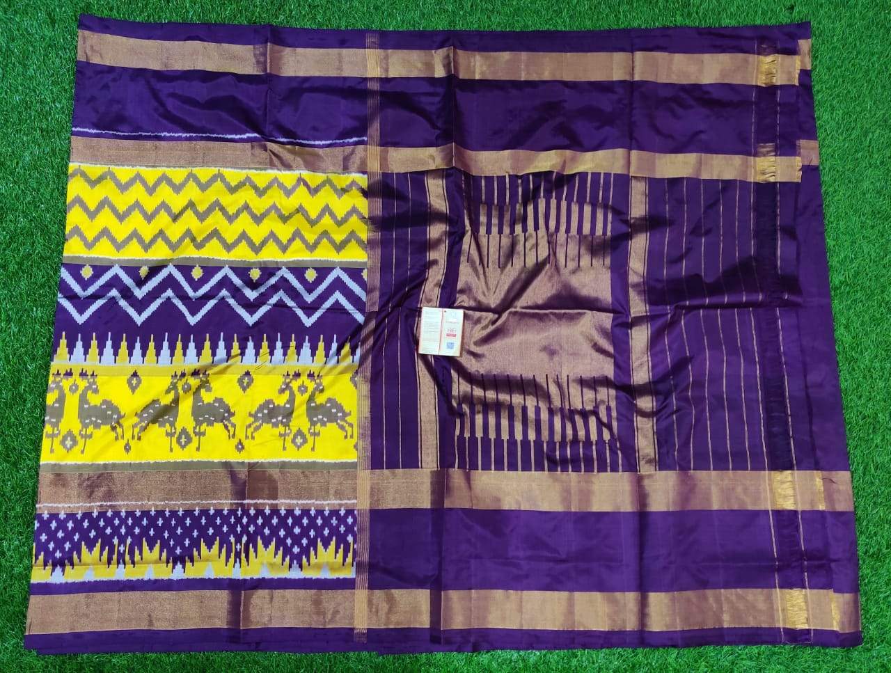 Blue and Yellow with Golden Stripes Pallu Ikkat Silk Saree