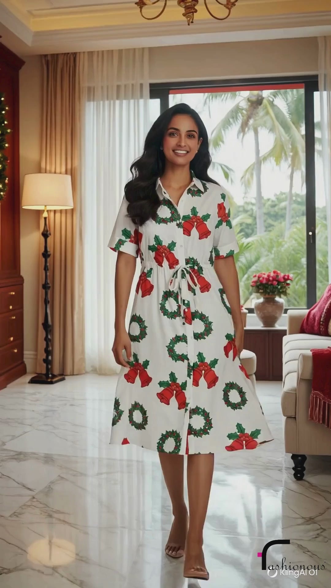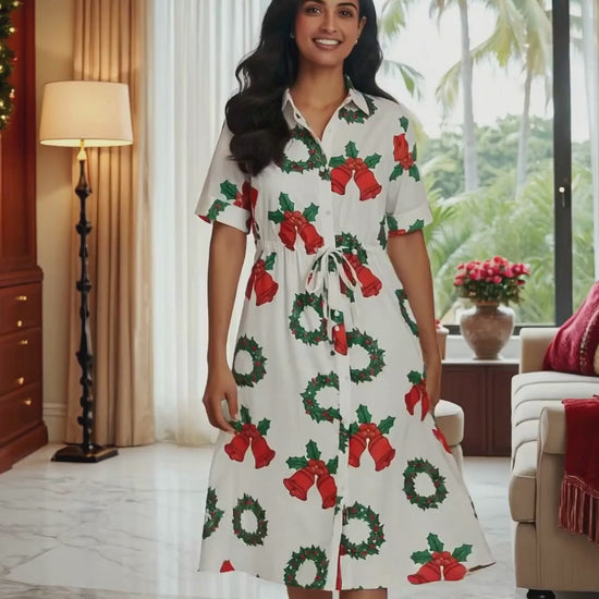 Our Jingle Joy Festive Shirt Dress features playful Christmas bells and wreath motifs on soft, breathable fabric—perfect for cozy gatherings, office parties, and all those “let’s take one more photo!” moments. ✨