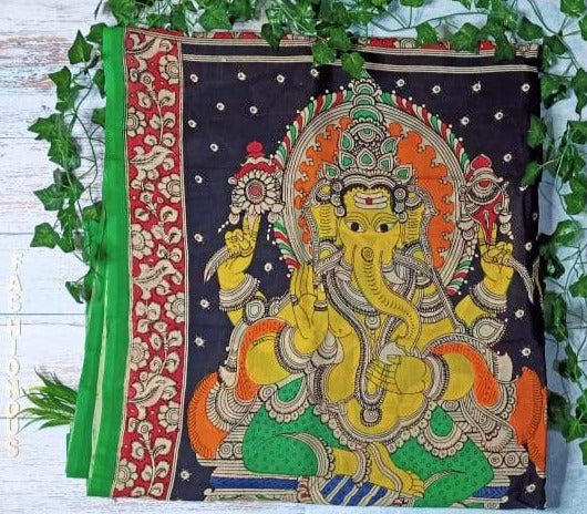 Multicoloured Dual Ganesha Hand-Painted Chennur Silk Kalamkari Saree