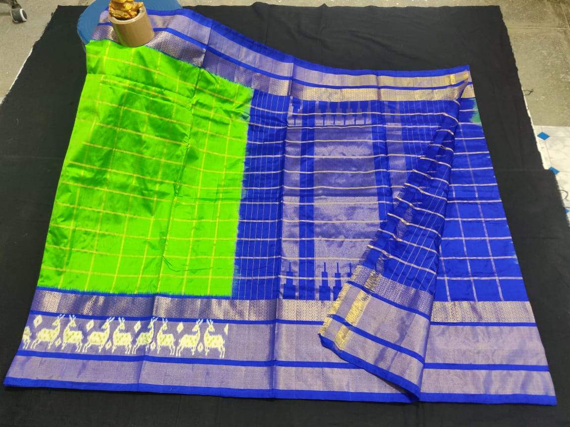 Light Green and Ink Blue Pure Ikkat Silk Saree with Deer Motif